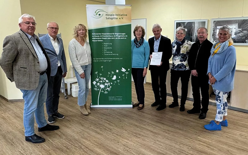 Reinhard Mann (Hospiz), Rainer Dworog und Simone Kessner (Geschäftsführung Konrad-Fonds), Gabriele Grabenhorst (Hospiz), OB Klingebiel (Kuratoriumsvorsitzender) , Angelika Fiegen, Ralf Kielkowsky und Koordinatorin Christine Fritsche (alle Hospiz)
