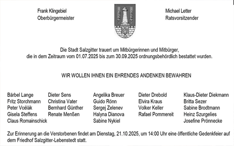 Am Dienstag, 21. Oktober, wird im Rahmen einer öffentlichen Gedenkfeier derer gedacht, die in der Zeit vom 1. Juli bis zum 30. September verstorben sind und für deren Bestattung die Stadt Salzgitter Sorge getragen hat.