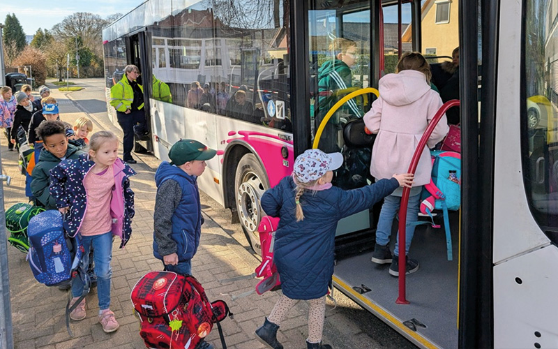 Die Sachbearbeiterin Prävention der Polizei Wolfenbüttel Claudia Fricke und Lukas Drake vom Busbetrieb Schmidt aus Wolfenbüttel haben mit den Kindern der Grundschule Dettum das richtige Verhalten im Bus und an der Bushaltestelle geübt. Die Klassen 1 bis 4 wurden im Rahmen des Präventionsangebotes „Fit im Bus“ in jeweils einer Unterrichtsstunde zunächst auf die zu beachtenden Regeln beim Busfahren hingewiesen.
